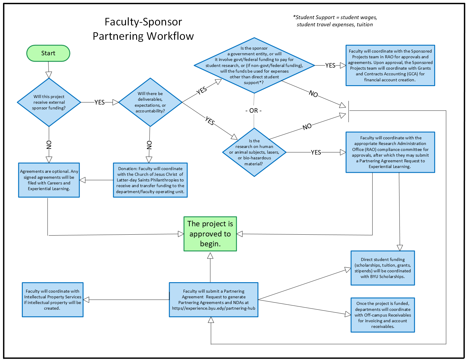 We look forward to assisting faculty members in navigating the partnering process with project sponsors. Please review the partnering process workflow below to learn of the partnering process, and the occasions when varied campus offices need to be involved in partnering depending on the project criteria and circumstances.For questions contact Adrienne Chamberlain at adrienne_chamberlain@byu.edu.